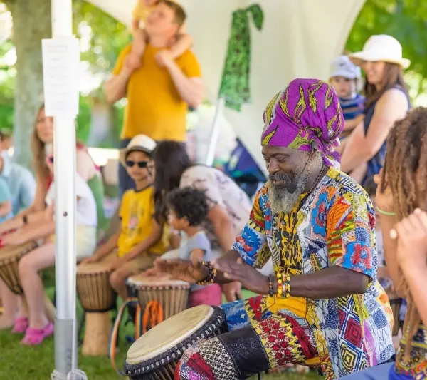 Djembe Drumming Workshops — hands-on sessions exploring the rhythms and traditions of West African drumming using the djembe, a goblet-shaped drum originating in West Africa that has become one of the most widely played hand drums in the world. The sessions are designed to be inclusive and accessible for all ages and experience levels.